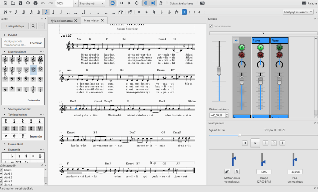 Ensin laulu tai biisi pitää nuotintaa. Käytän ilmaista MuseScoren ohjelmaa, joka on helppokäyttöinen ja sen saa suomenkielisenä ja varmaan useammalla kielivaihtoehtona. Kun olen laittanut nuotit ja soinnut, sen saa exportattua midi-tiedostona esim Cubaseen, jota käytän.