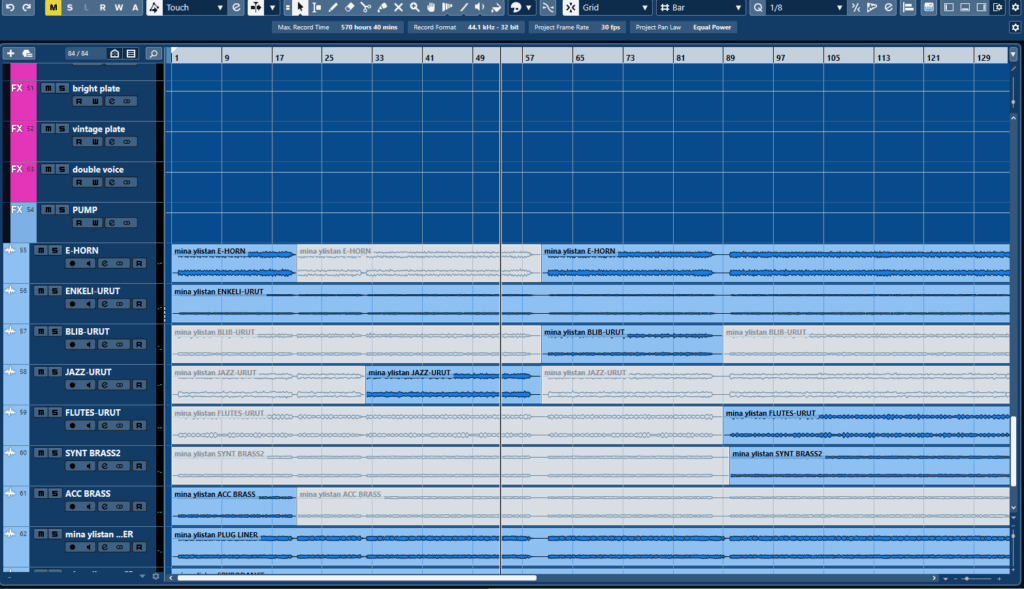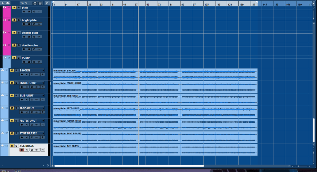 Nyt kun biisissä on erilaisia soittimia ja eri kohdissa, niin yleensä käytän sitä samaa midiraitaa ja valitsen eri instrumenttejä ja ”nauhotan” eli exporttaan ne aina koko biisin alusta loppuun, koska en voi tässä vaiheessa tietää, että mitä instrumenttiä missäkin kohdassa käytän.