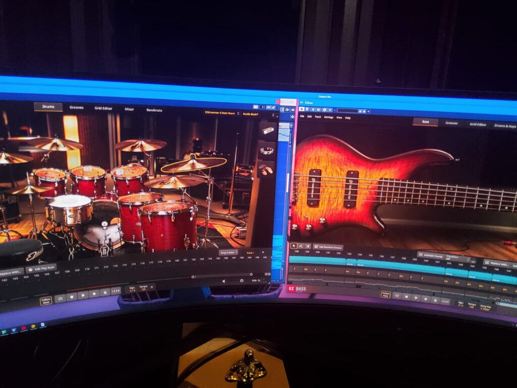 Tässä vaiheessa, kun on tuo melodia ja soinnut vielä midinä, mutta ne ovat siinä kuunneltavissa, rakennan ns pohjan, eli laitan rummut ja bassokitaran.